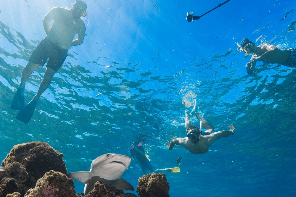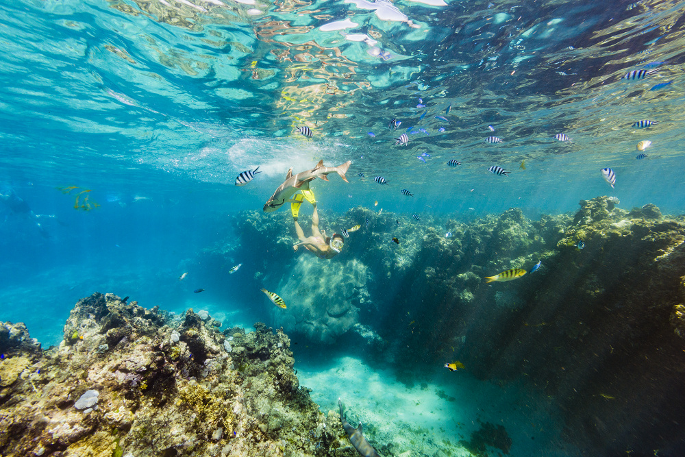 在夸塔岛,您可以在湛蓝的海水中与礁鲨一起享受超现实的浮潜体验