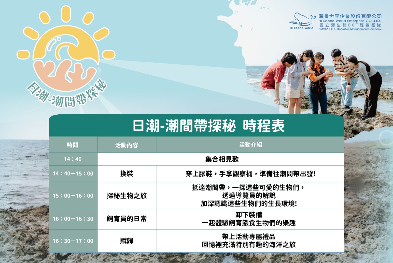 换上迷你背心加入解说行列,海生馆将带领小大人们学习海洋生物知识,元气满满的迷你解说员们大展身手,向亲友分享所学内容,卸下解说员工作任务后,享用海生馆准备的美味菜肴,紧接着前往秘密花园聆听鱼儿们的成长故事,带着更多好奇探索世界,探索夜间的海洋,进入梦乡前,让美丽的鱼群伴你入眠.一日之计在于晨,隔日早上七点,跟随着解说员大哥哥大姐姐们一同唤醒夜宿来宾们,欣赏大洋喂食的鱼儿进食,户外潮间带的真实体验,活动最后的海洋生态课程,带着大小成员更深入了解海洋议题,人小鱼大的迷你解说员下班啰~海生馆给予鼓励、证书、徽章,