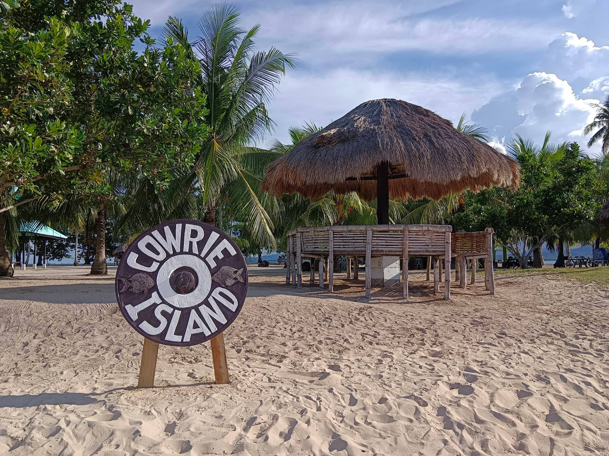 海滨,中间有一个久保,前景有一个圆形标志,上面写着“Cowrie Island”
