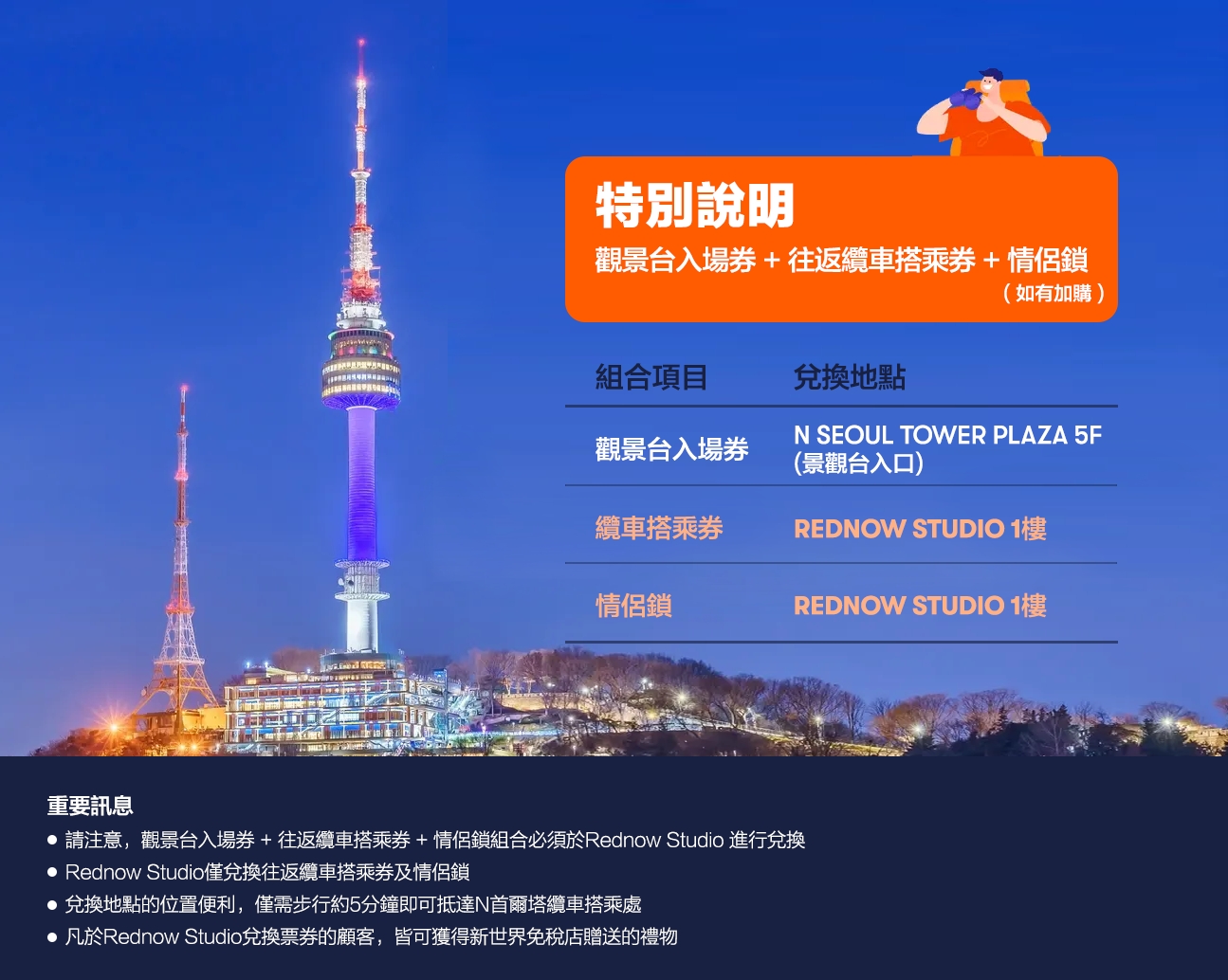 N首尔塔坐落在南山公园美丽的自然环境中,高耸的山顶上,为游客提供了俯瞰整个城市的绝佳视野。 快速登上近500米高的N首尔塔瞭望台,探索这座令人惊叹的纪念碑。 远离都市喧嚣,将首尔美景尽收眼底。 白天,您可以欣赏到城市的全景,远眺连绵起伏的群山;夜晚,您可以观赏闪烁的城市灯光与点点繁星交相辉映。