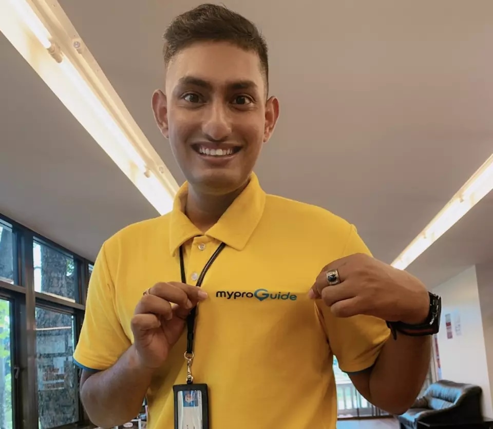 在集合点寻找穿着 MyProGuide 衬衫或手持 MyProGuide 标志的向导