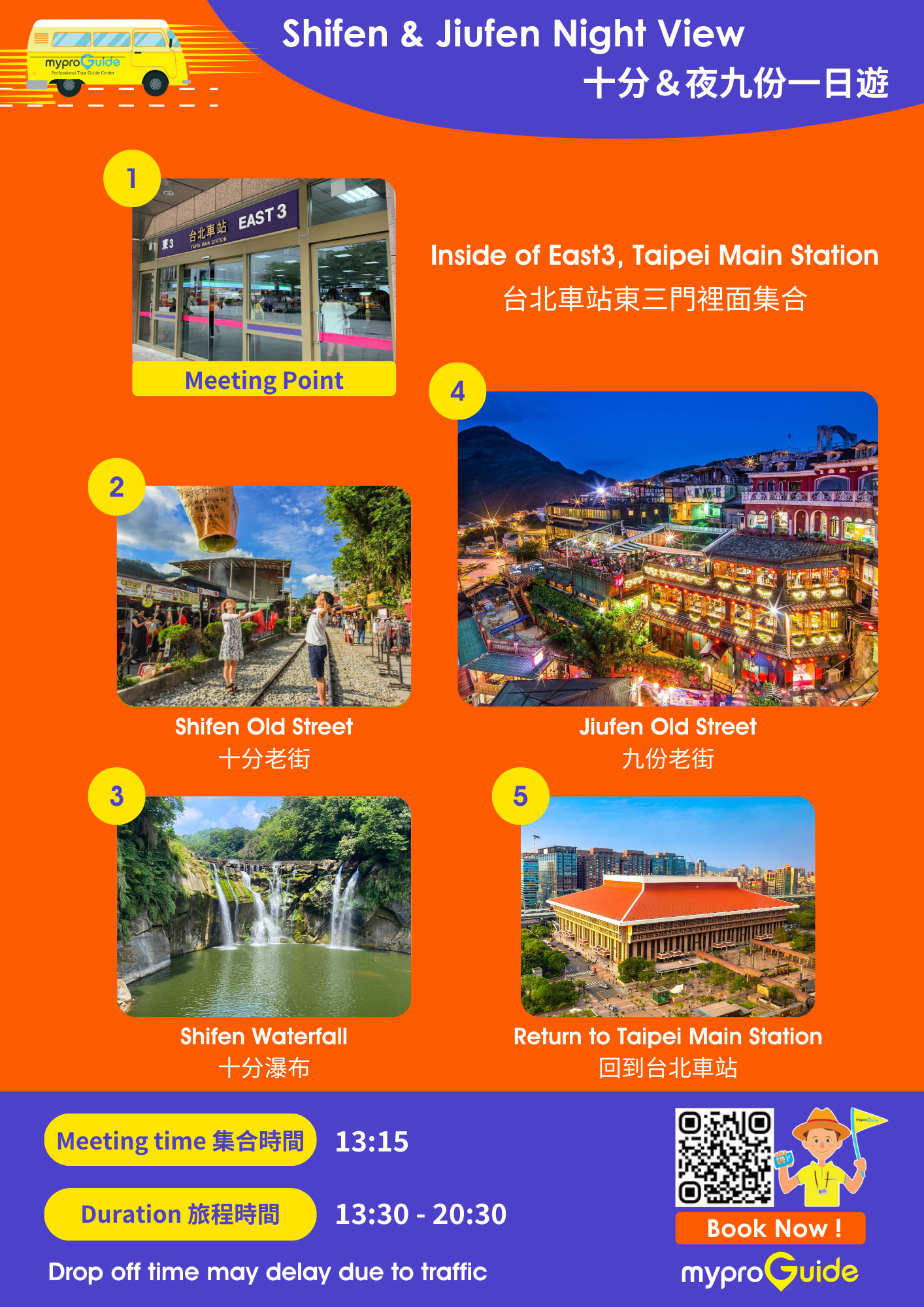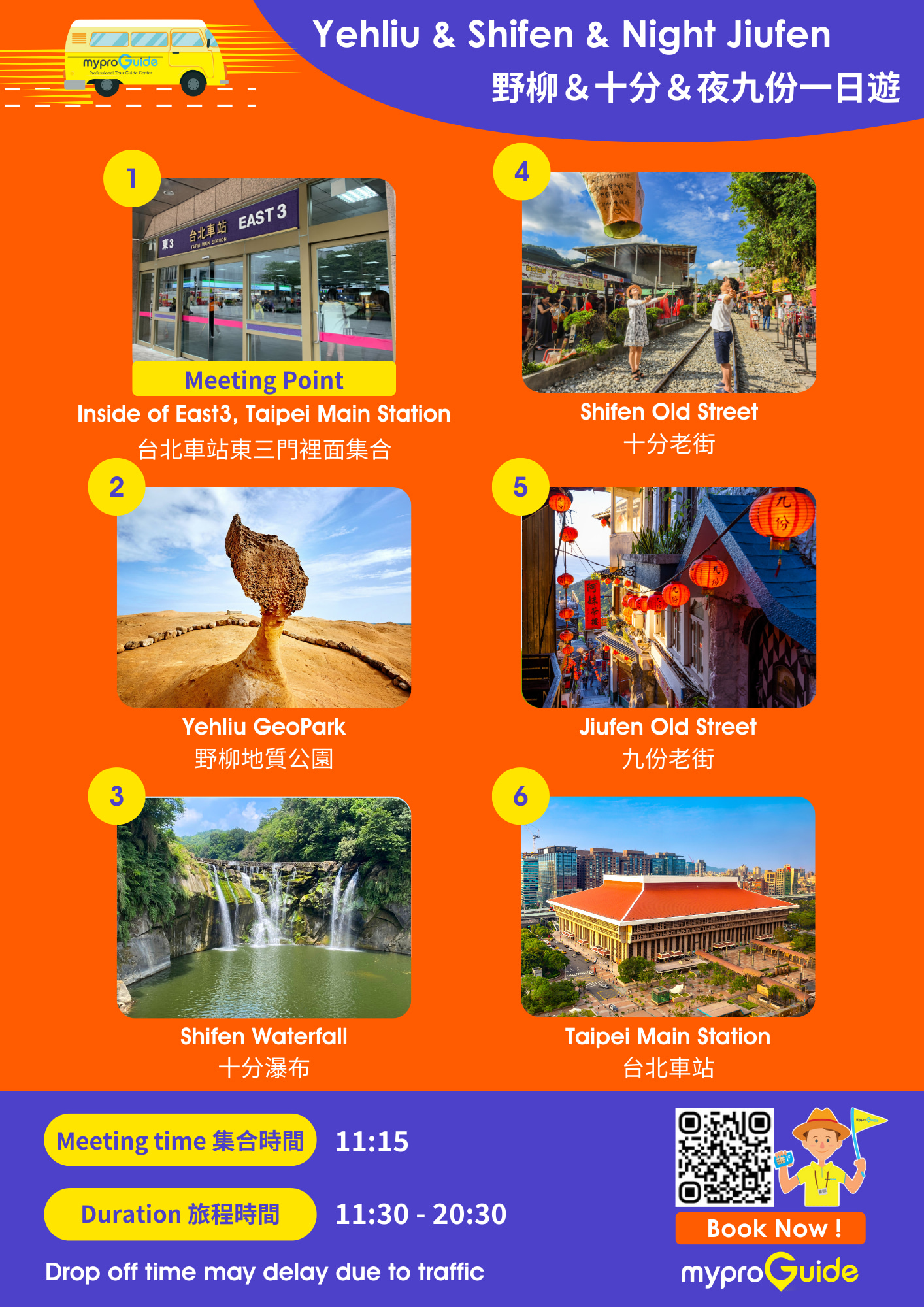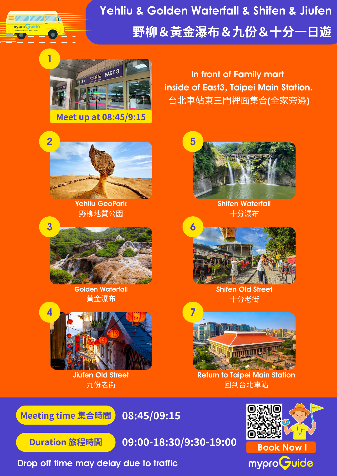 搭乘接驳巴士,从台北出发,轻松玩遍野柳、九份和十分!中途停留野柳、阴阳海、十三层遗址、黄金瀑布、九份及十分,台湾东北角看透透!同车乘客几乎都是来自世界各地的背包客,尽情在车上聊着彼此的故事,分享在台北旅行的大小点滴、旅途趣事,甚至能结交志同道合的朋友,让路途不再单调乏味,而是充满惊喜欢乐!