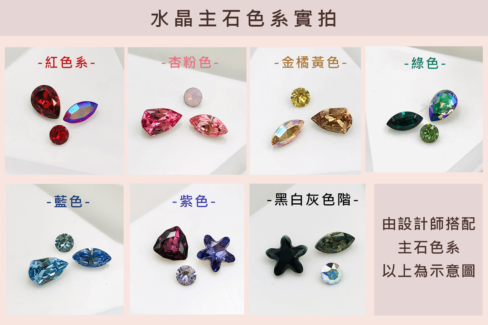 * 难易度:★☆☆☆☆ 1颗星带领大家认识晶钻土,由设计师搭配色系的水晶,多款主石色系可选。