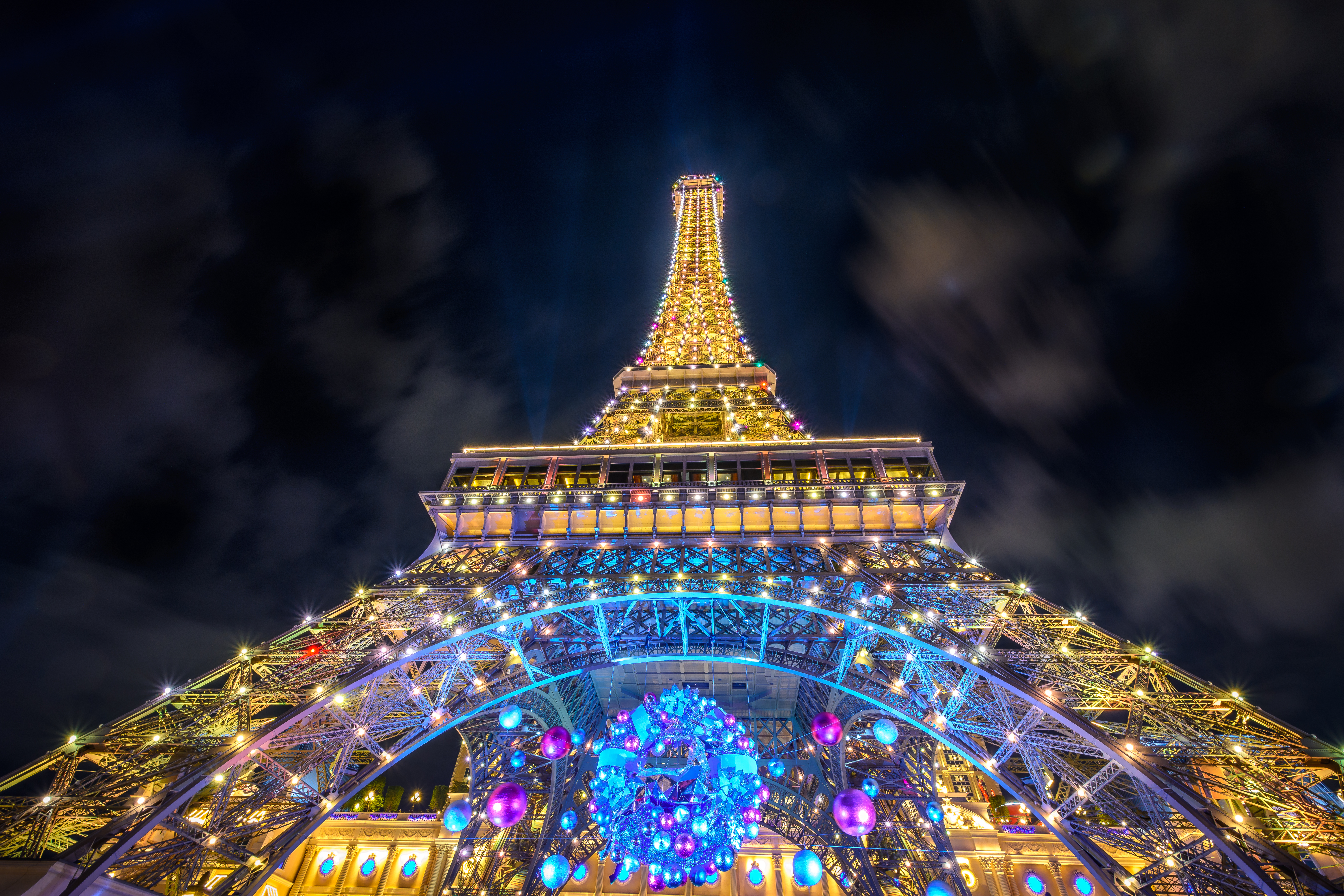 澳门巴黎铁塔灯光秀与夜幕结合,美不胜收