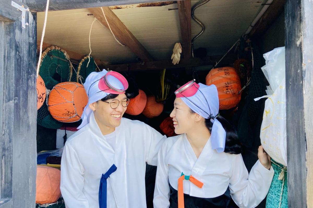 穿着济州岛的传统海女服拍摄难忘的生活照。