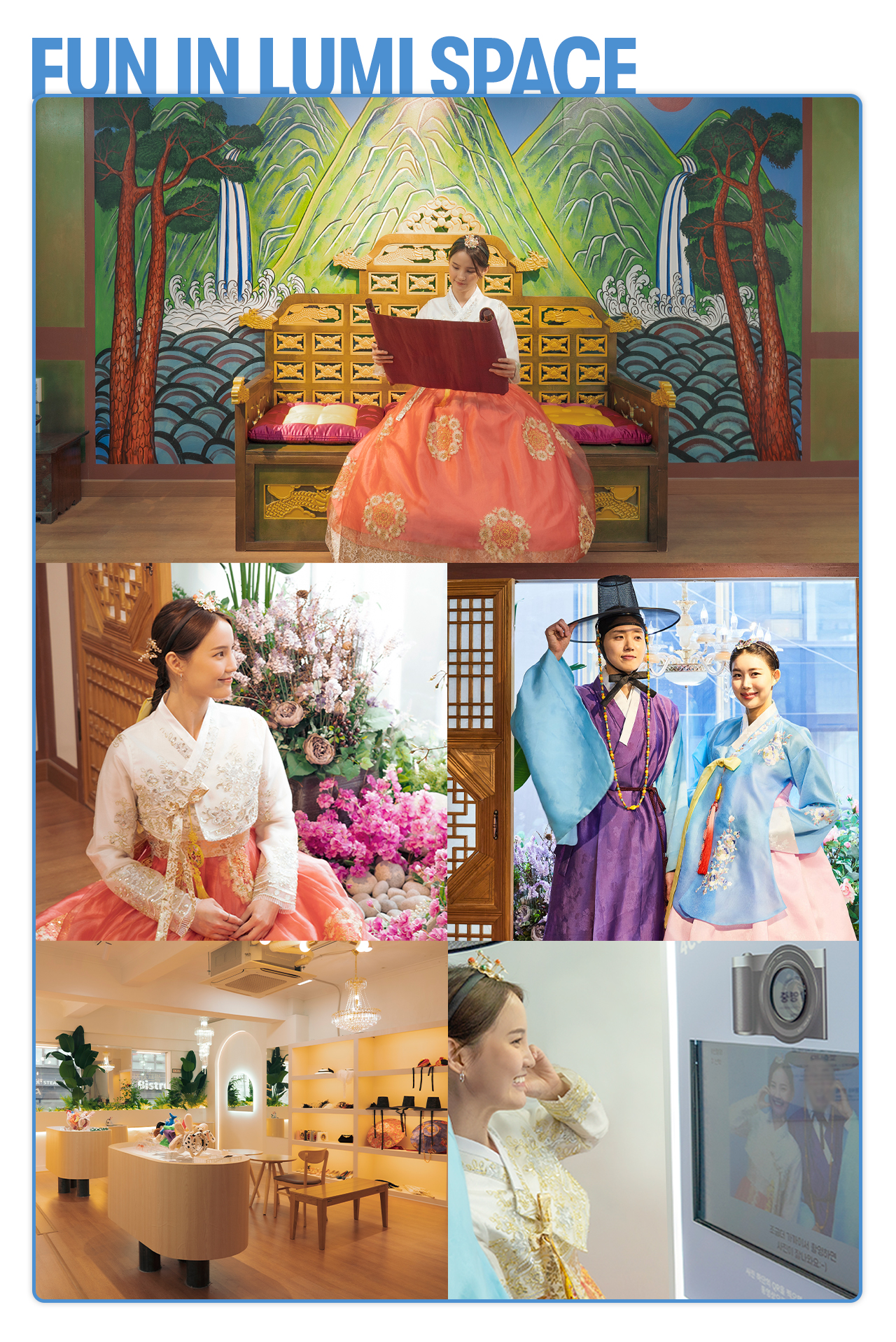 该空间包括传统拍照区、配有北欧吊灯的现代区域和令人惊叹的壁画。其他设施包括派对室、配有工作人员协助的更衣室以及供应咖啡和传统茶的咖啡馆。距离明洞站仅一分钟路程,是与亲人创造永恒回忆的理想场所。