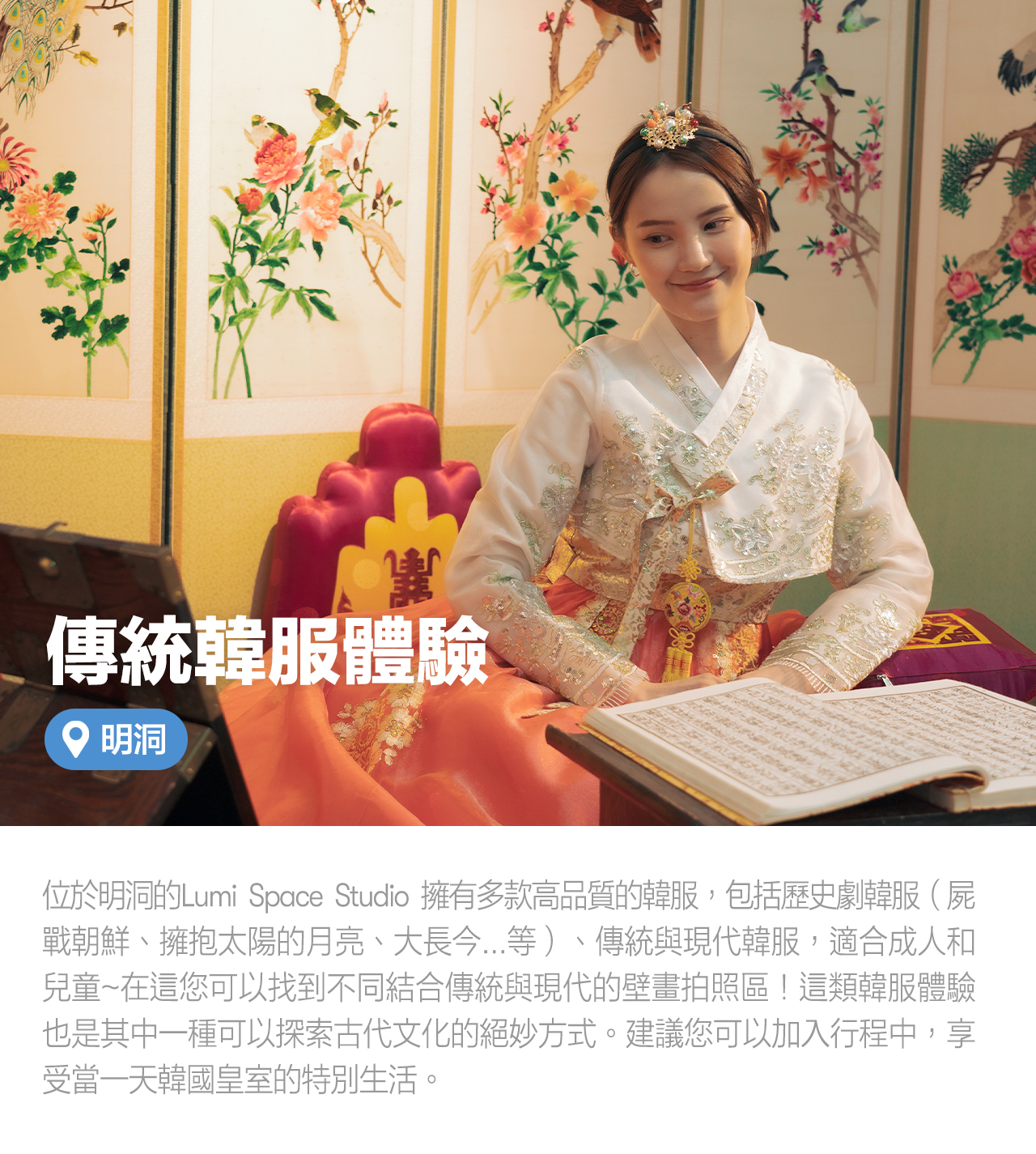 作为韩流历史剧的重镇,MBC 大长今公园已迁至首尔明洞,让粉丝们可以更轻松地体验韩国文化。新开的 Lumi Space 提供 250 套高品质韩剧服装,包括《王国》、《拥抱太阳的月亮》和《大长今》,以及适合所有年龄段的传统韩服和启蒙时期服饰。