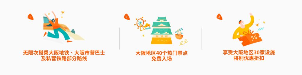 轻松享指定交通工具无限次搭乘、40个大阪热门景点免费入场、30个大阪地区设施折扣优惠