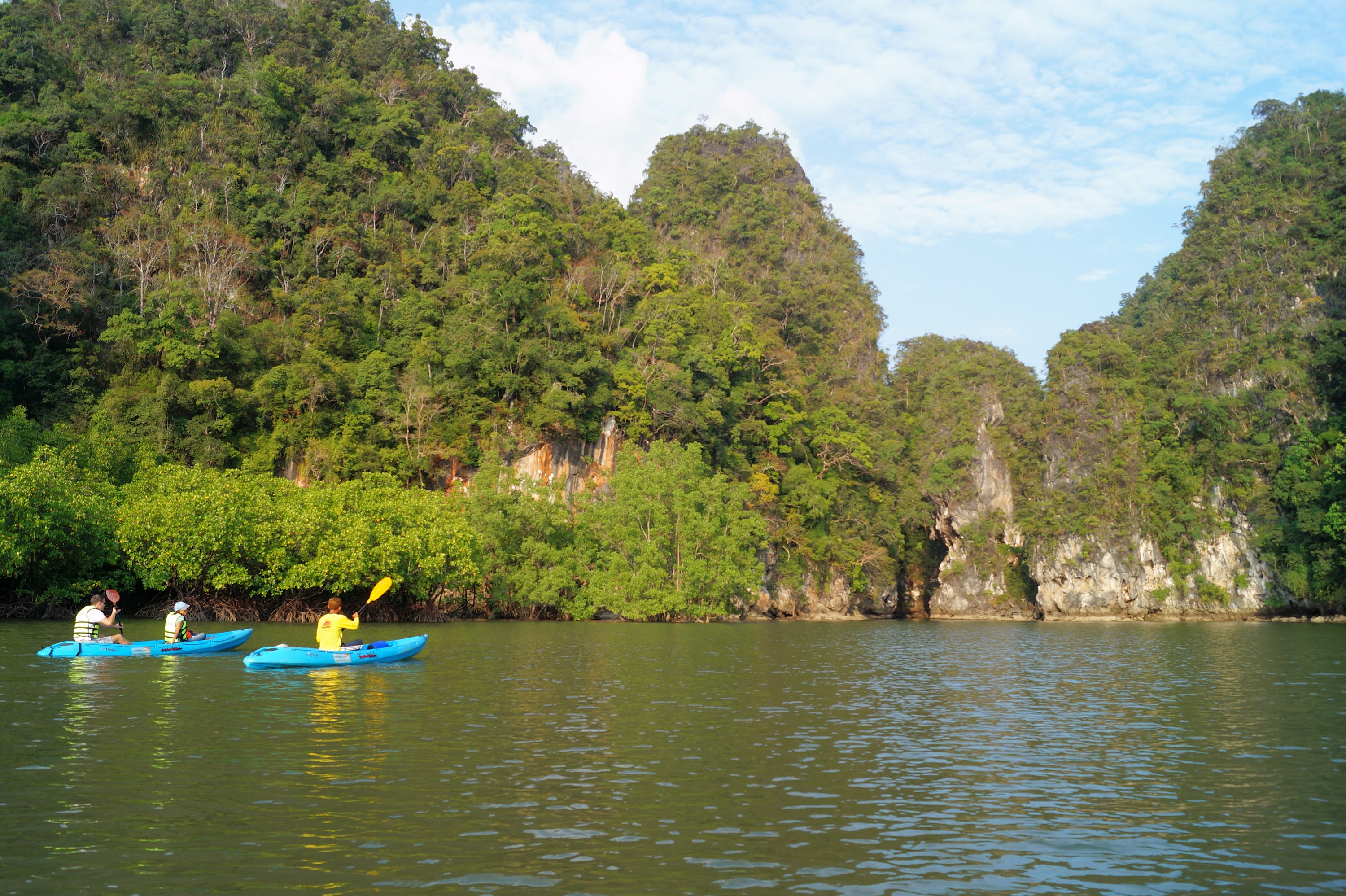 从发射点开始在开阔水域划一小段距离,到达 Ao Thalane 的红树林。向导将带您穿过浅水道、淹没的树根,甚至就在高耸于您上方的几乎垂直的石灰岩悬崖旁边。发现悬崖上的历史画作,据说这些画作是由曾经居住在该地区的海上吉普赛人绘制的。