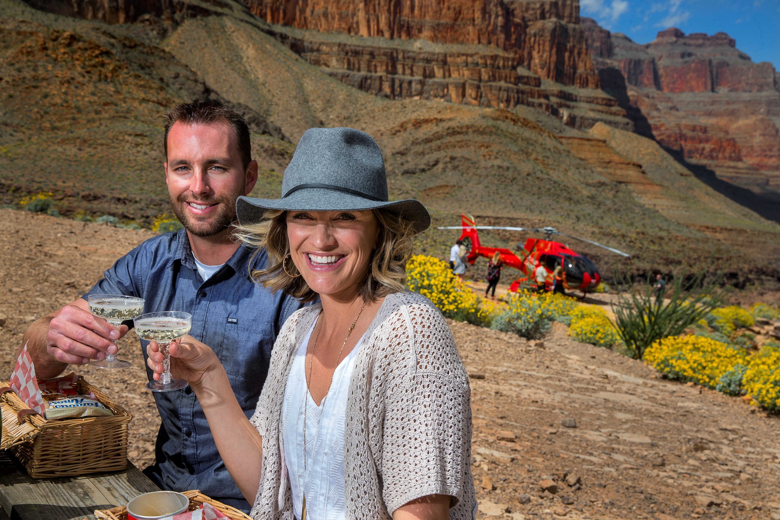 在大峡谷与心爱的人享受野餐和庆祝香槟