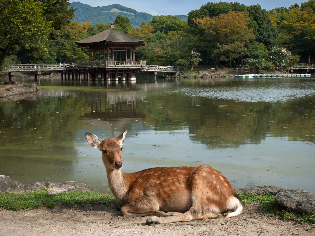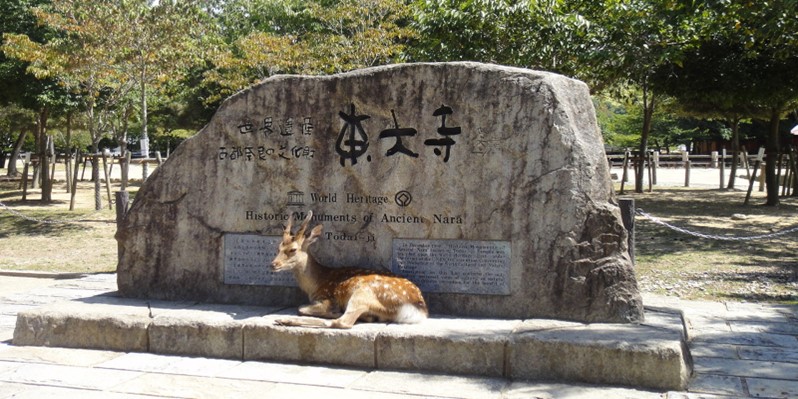 东大寺位于奈良鹿公园的深处位置,沿著公园的导览"鹿"线,沿路成群的梅花鹿,能自由的和鹿嬉戏玩耍喂食再慢慢散步到东大寺参观。沿街商店也有贩售鹿仙贝(鹿饼干),供游客购买喂食梅花鹿,也可自行准备饼干。传说中春日大社竹神祇,就是乘著鹿降临于此地的。