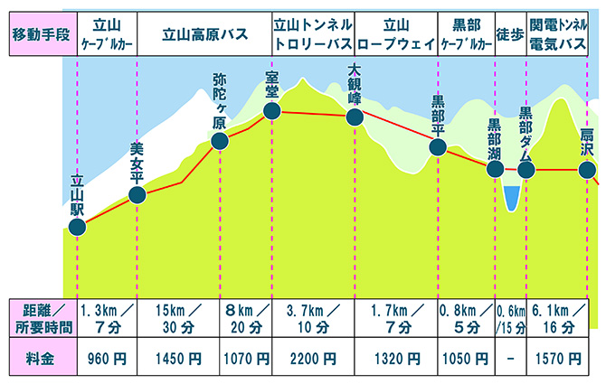 乘坐六种公共交通工具穿越阿尔卑斯山脉、扇泽(电气巴士16分钟)-黑部水坝(登山缆车5分钟)-黑部平(空中索道5分钟)-大观峰(无轨电车10分钟)-室堂雪谷漫步停留约2小时(高原巴士50分钟)-美女平(登山缆车7分钟)-立山站