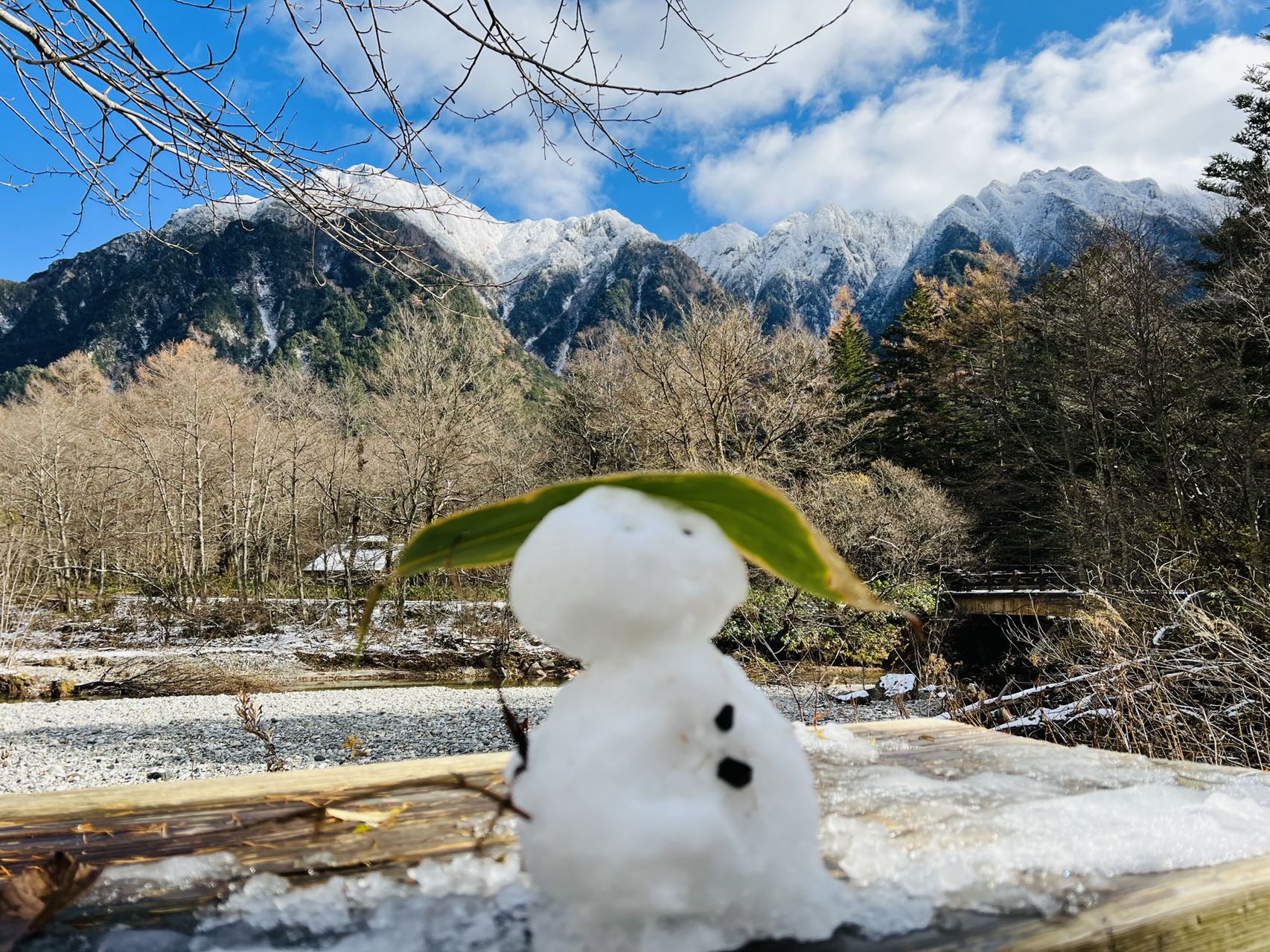 在冬季的上高地,游客可以一边堆雪人一边欣赏雪山美景