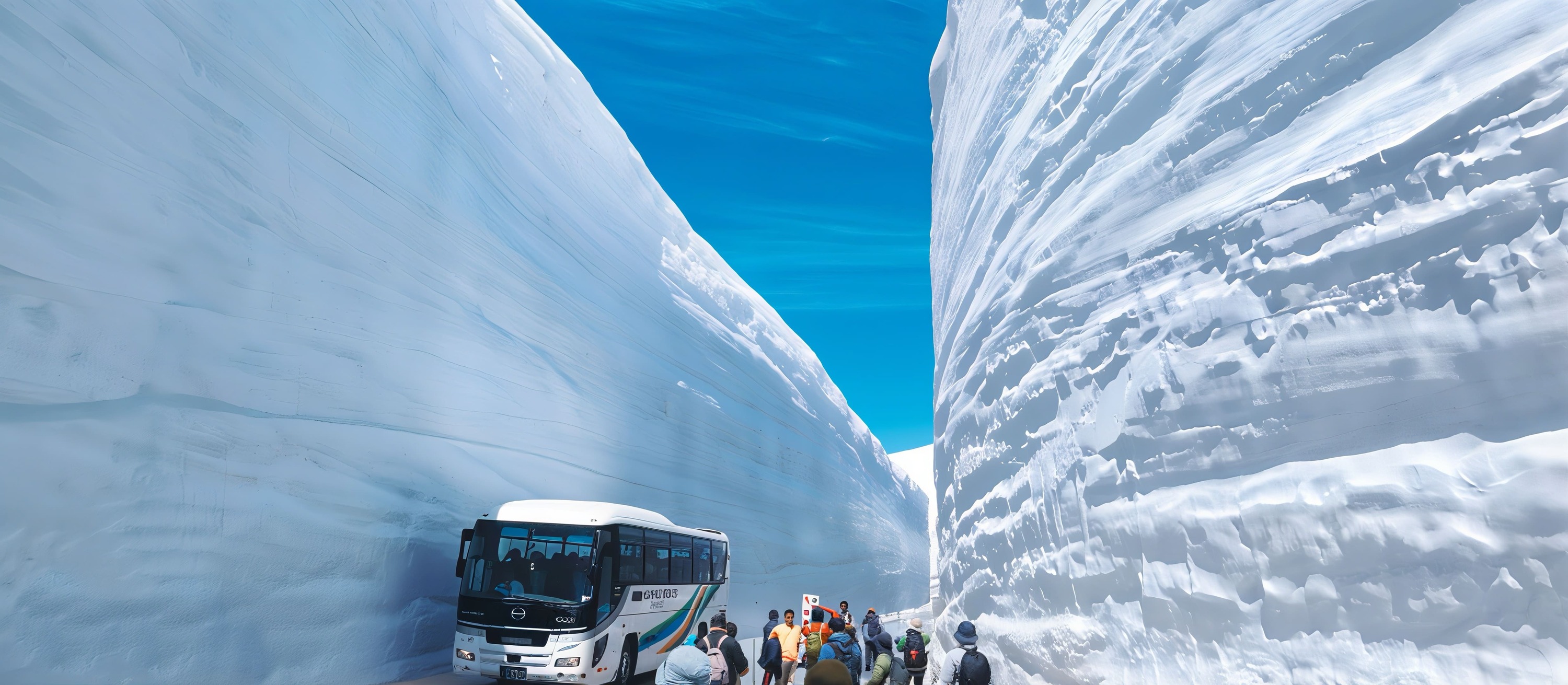 扇泽站→关电隧道电动巴士→步行参观著名的黑部水库→黑部站→黑部平→立山索道→大观峰→立山隧道无轨电车→室堂(海拔2450m的雪谷步行约60分钟)→立山高原巴士→美条平 → 立山缆车 → 立山站