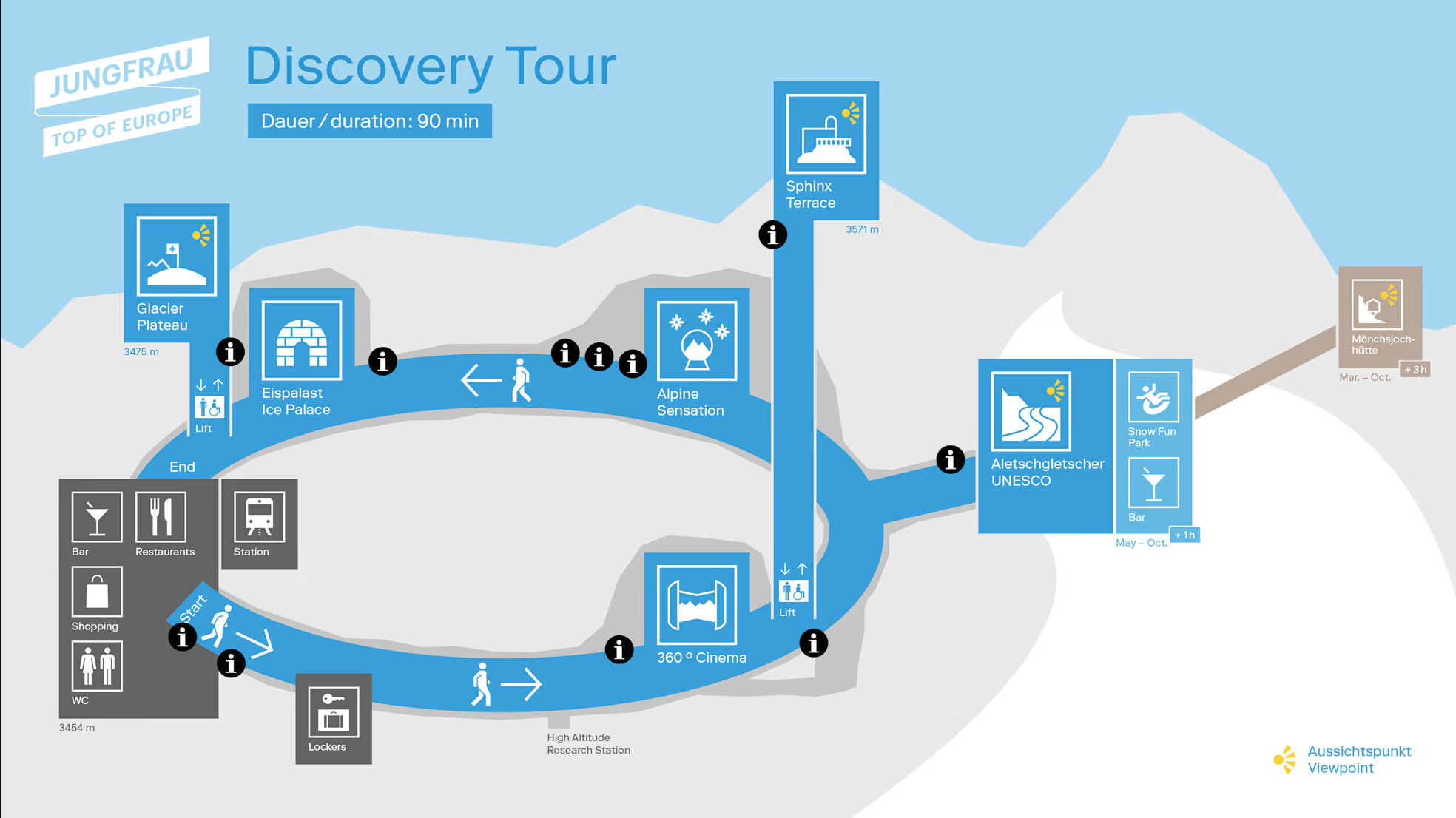 **返程注意事项:** 请注意时间,尤其是在徒步前往门希小屋 (Mönchsjochhütte) 时,因为返回少女峰 (Jungfraujoch) 可能需要更长时间。