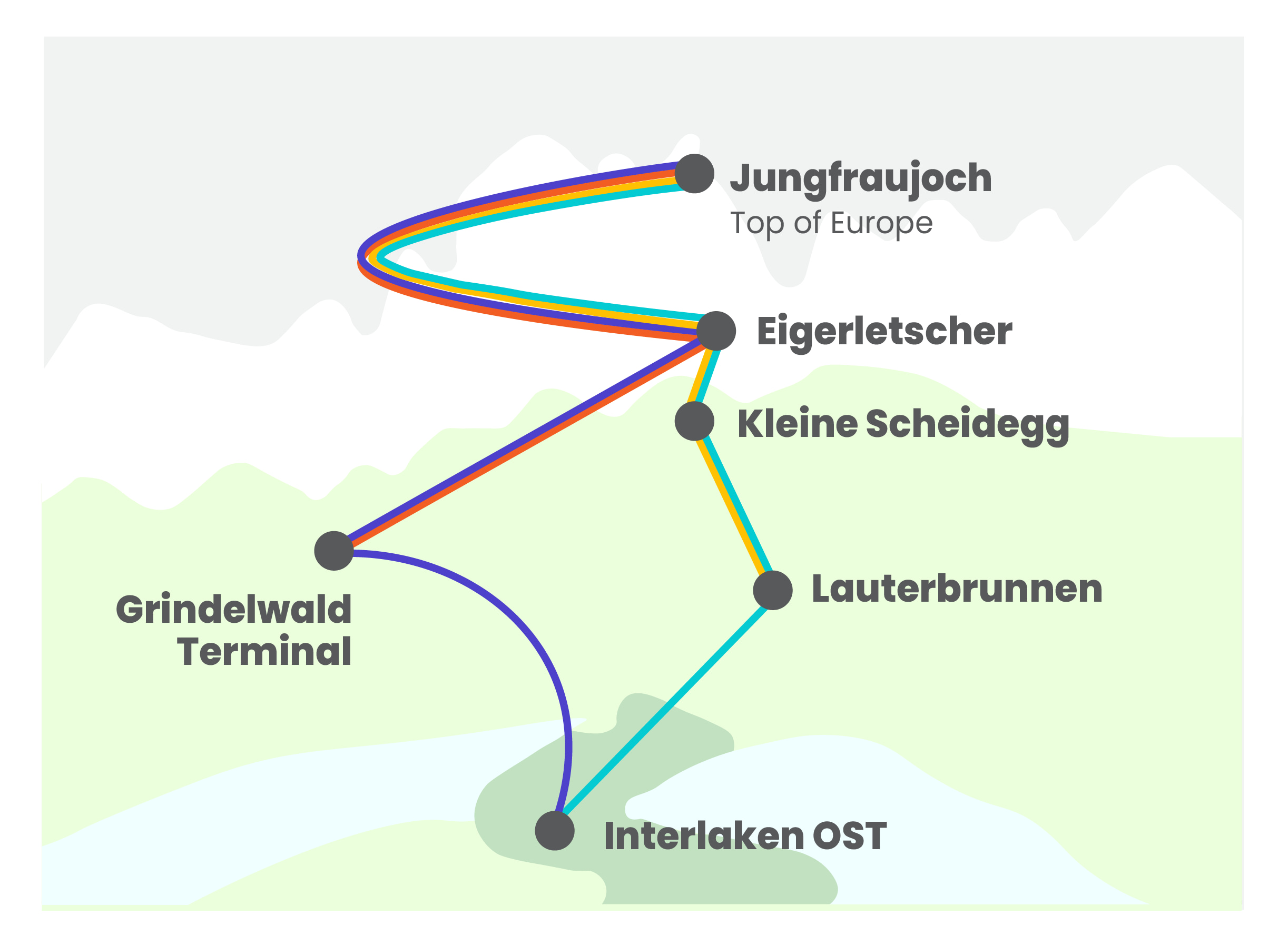 **艾格峰快车 (Eiger Express) 返回行程:**如果您前往格林德瓦,请在艾格峰冰川站换乘火车。