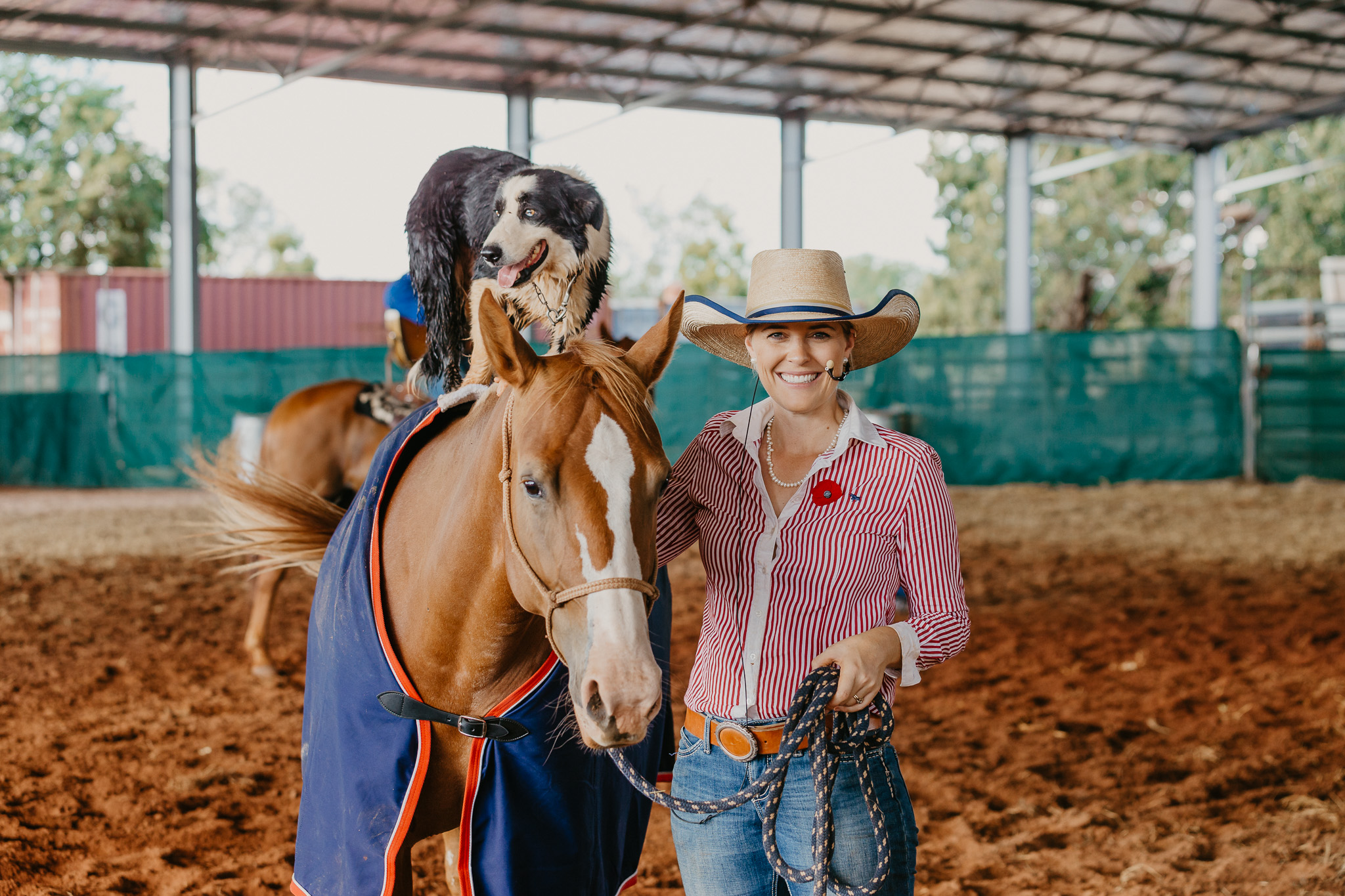 游客坐在室内竞技场阴凉处舒适的高架座位上,观看并学习年轻的马匹和牧牛犬如何在土地上接受工作生活的训练。团队解释了训练过程背后的心理学,并强调了建立在信任基础上的关系可以取得什么成果。