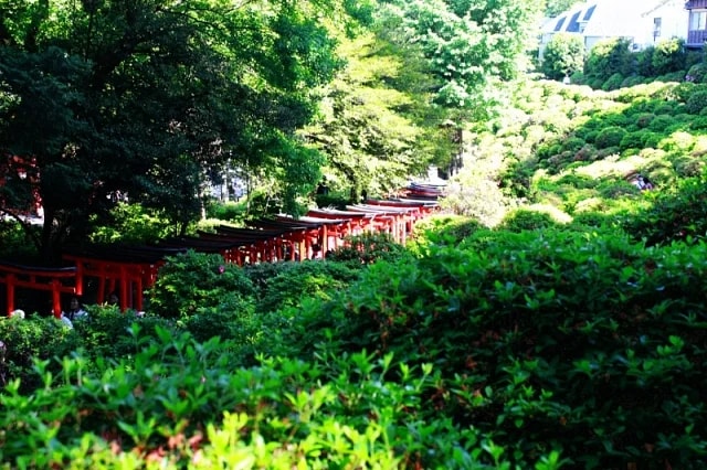 根津神社坐落在郁郁葱葱的绿色植物中,有鲤鱼池、小神社拱门隧道般的小道以及优雅且色彩美丽的木结构建筑