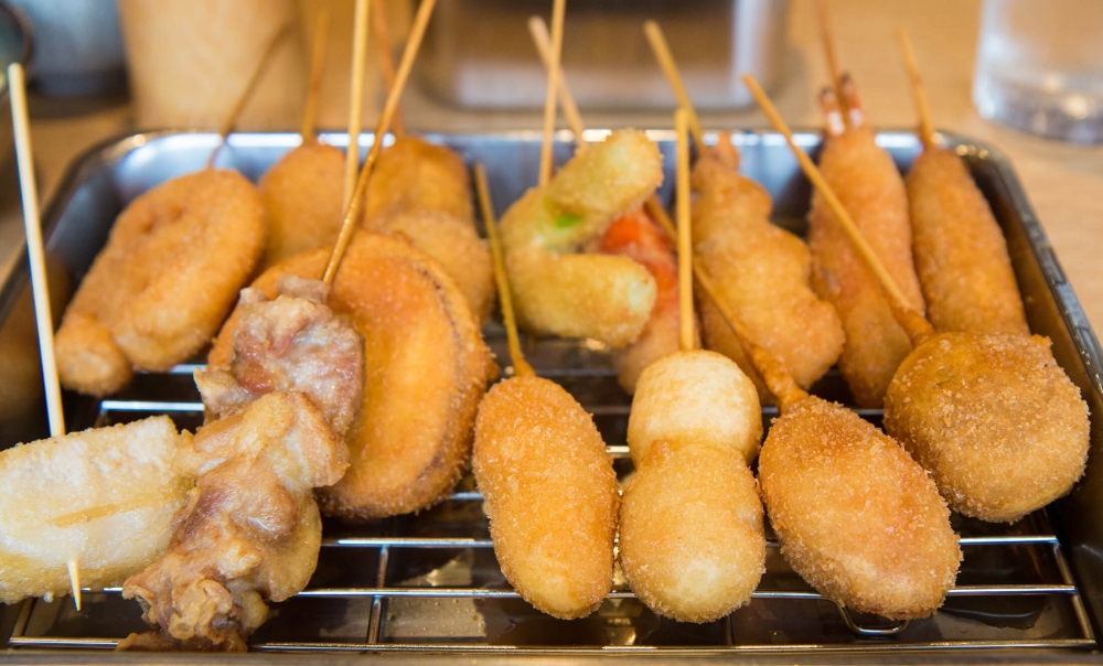 与炸猪排类似的关西地区菜肴,将肉和蔬菜串起来,然后用面糊炸制而成
