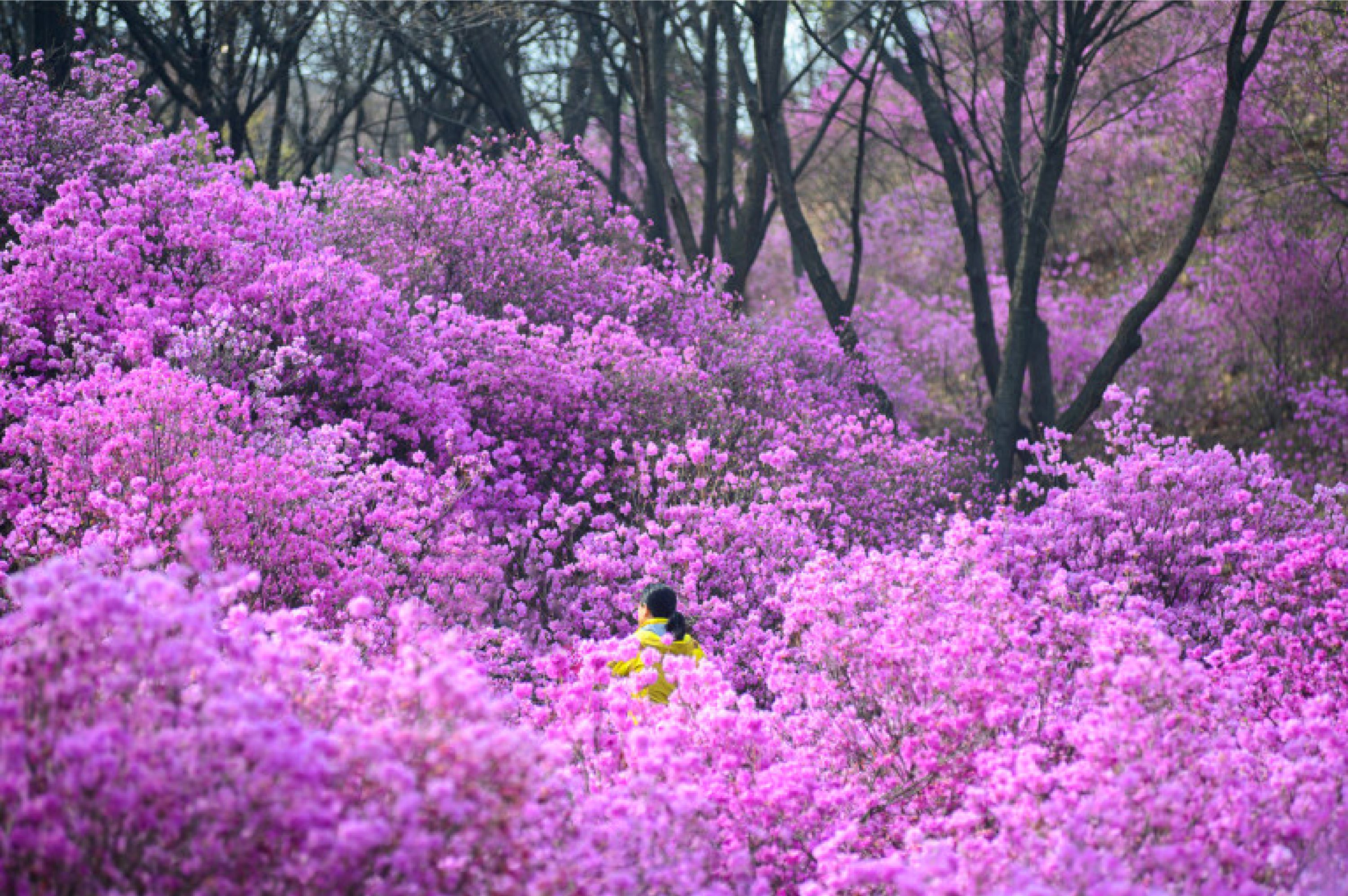 杜鹃花盛开时,山上就变成了一片令人惊叹的粉色、紫色和白色花海。