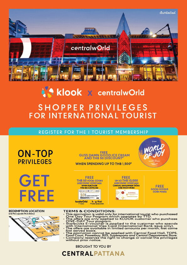 KLOOK客路顾客可获赠中央世界免费优惠券,有效期至2024年12月31日(兑换地点:二楼PAUL Bakery对面)