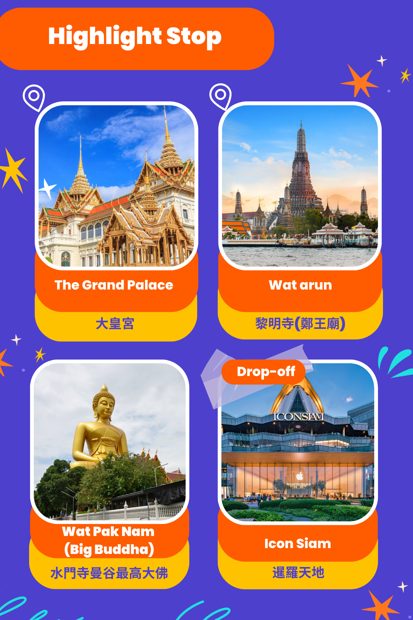 踏上难忘的寺庙一日游,探索曼谷雄伟的地标。从令人惊叹的大皇宫开始您的旅程,那里闪闪发光的金色尖顶和复杂的建筑细节将您带入一个富丽堂皇的世界。接下来,参观黎明寺,它沿着湄南河优雅地矗立,其引人注目的陶瓷马赛克设计吸引着您的感官。在白南寺 (Wat Pak Nam) 结束您的冒险之旅,这是一颗隐藏的宝石,以其宁静的氛围和宁静的花园而闻名。