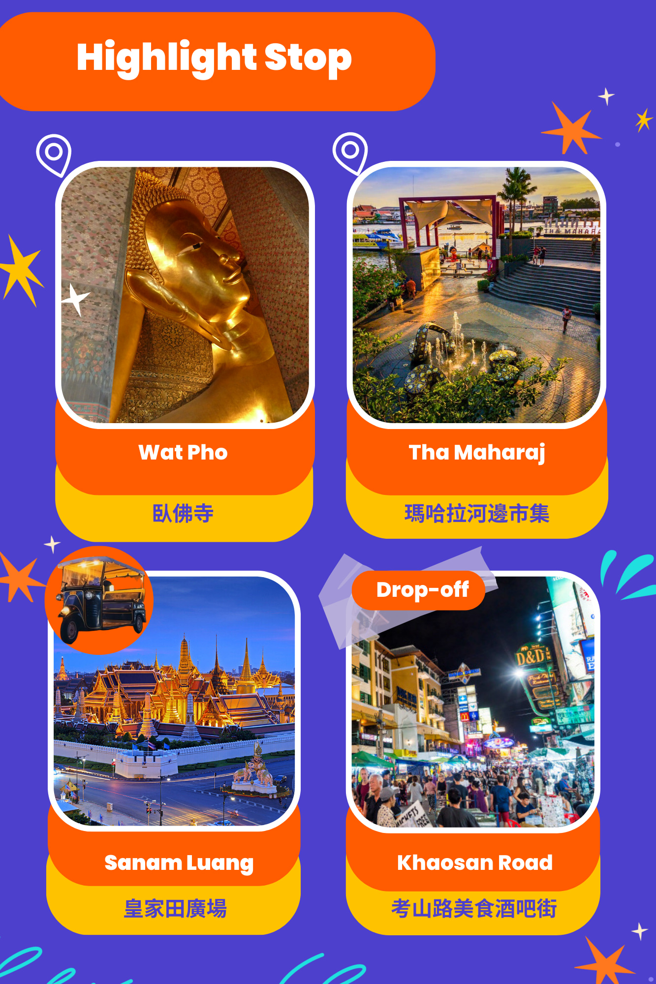 从令人惊叹的卧佛寺建筑群开始。当您探索其广阔的土地时,您会被闪闪发光的金色尖塔、错综复杂的雕像和标志性的卧佛所迷住。从那里,您可以前往充满活力的河畔社区 Tha Maharaj,在那里您可以感受当地的氛围,品尝美味的街头小吃,并浏览迷人的精品店。跳上嘟嘟车,开始游览皇家田的惊险旅程,包括大皇宫和城柱神社。继续您的旅程,前往热闹的考山路,这里以其热闹的活力和充满活力的夜生活而闻名。沉浸在热闹的气氛中。尽情享受美味的街头美食,并在街道两旁的众多酒吧之一喝一杯。