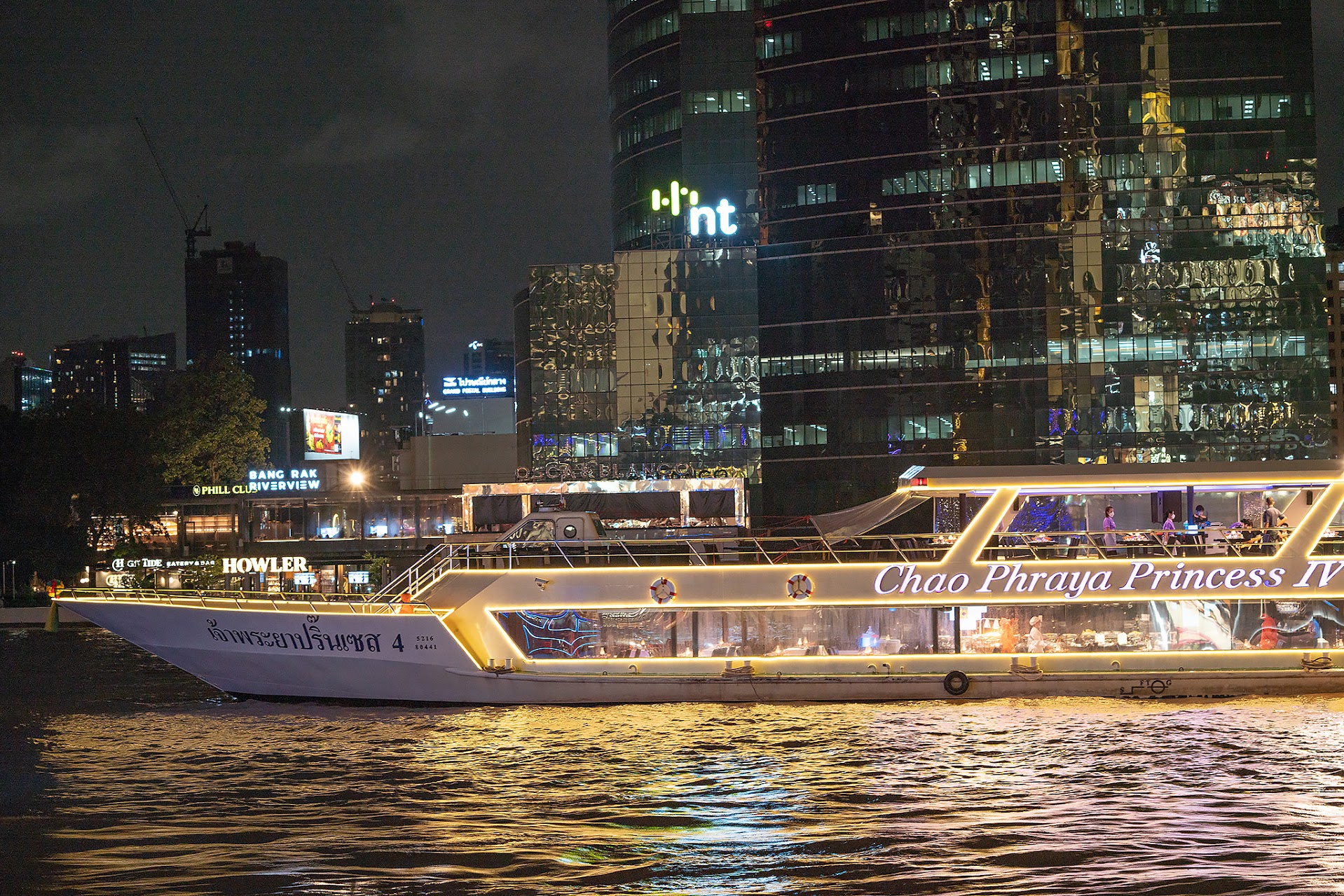 在游轮上享用晚餐并欣赏曼谷夜景,结束一天的行程