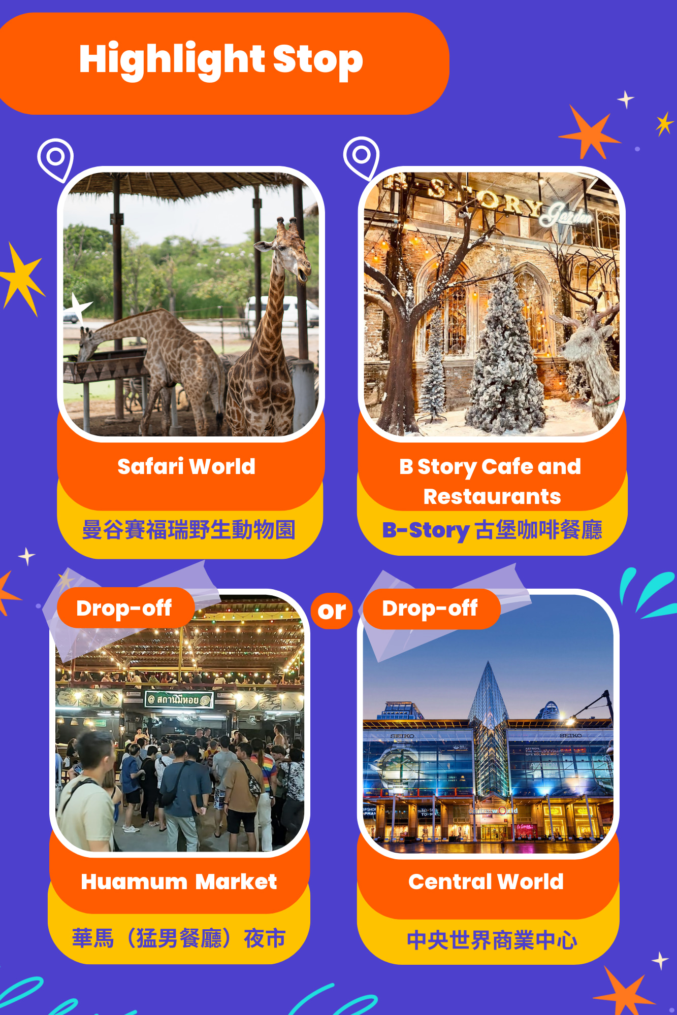 参加我们的曼谷野生动物世界、B Story 花园和 Huamum 市场一日游,踏上难忘的冒险之旅。沉浸在野生动物世界迷人的野生动物保护区,在那里您将近距离接触奇异的动物。探索迷人的 B Story 花园,这里是鲜花盛开、环境宁静的天堂,将带您进入宁静的境界。最后,深入探索充满活力的瓦穆姆市场,那里有熙熙攘攘的摊位和芳香四溢的街头小吃。