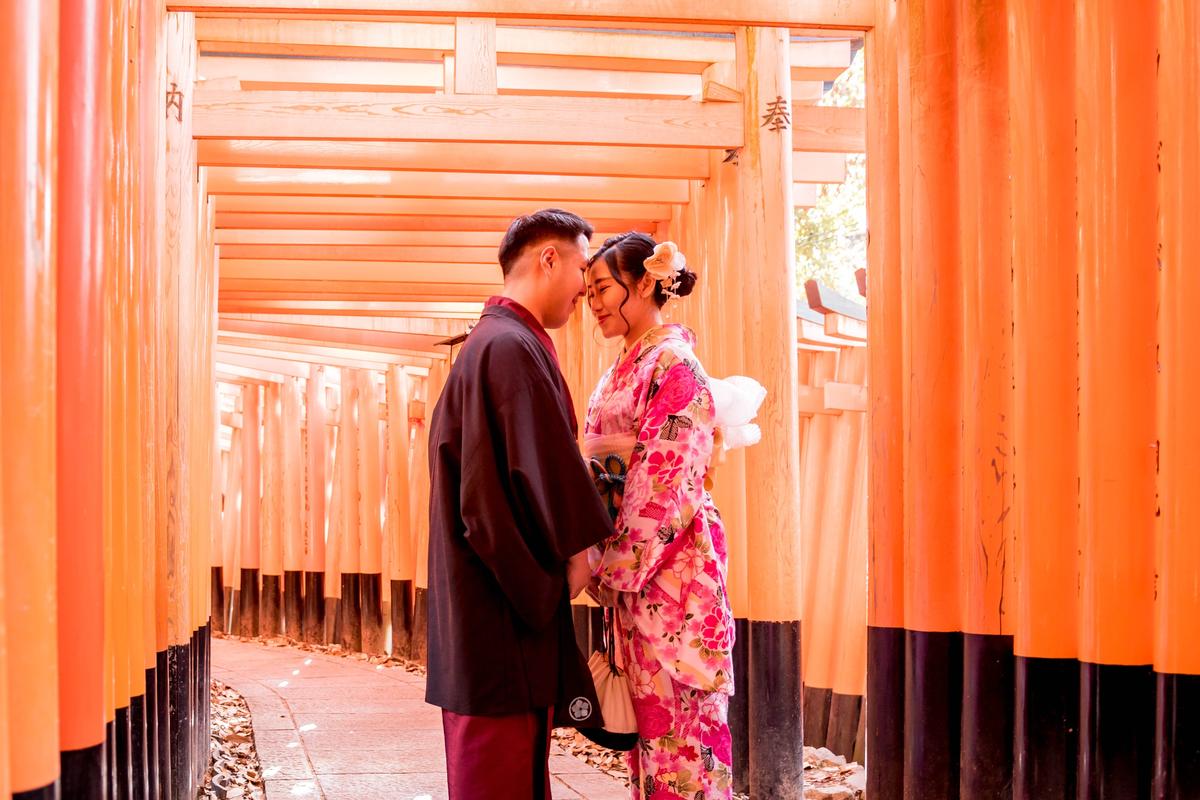 会讲中文和英语的接待人员将热情欢迎您的光临。请从众多的和服中找到您最喜欢的和服。专业的造型师会为您量身定制和服,专业的美发师会为您做头发,让您焕然一新。随后,我们前往距离店步行5分钟的伏见稻荷大社,并在著名的千本鸟居拍照留念!拍完在日本的美好回忆后,回到商店换衣服。