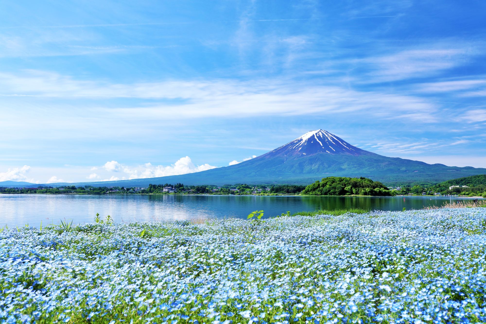 湛蓝的天空下,平静的湖畔,盛开着一大片蓝色的粉蝶花,富士山的景色令人惊叹。