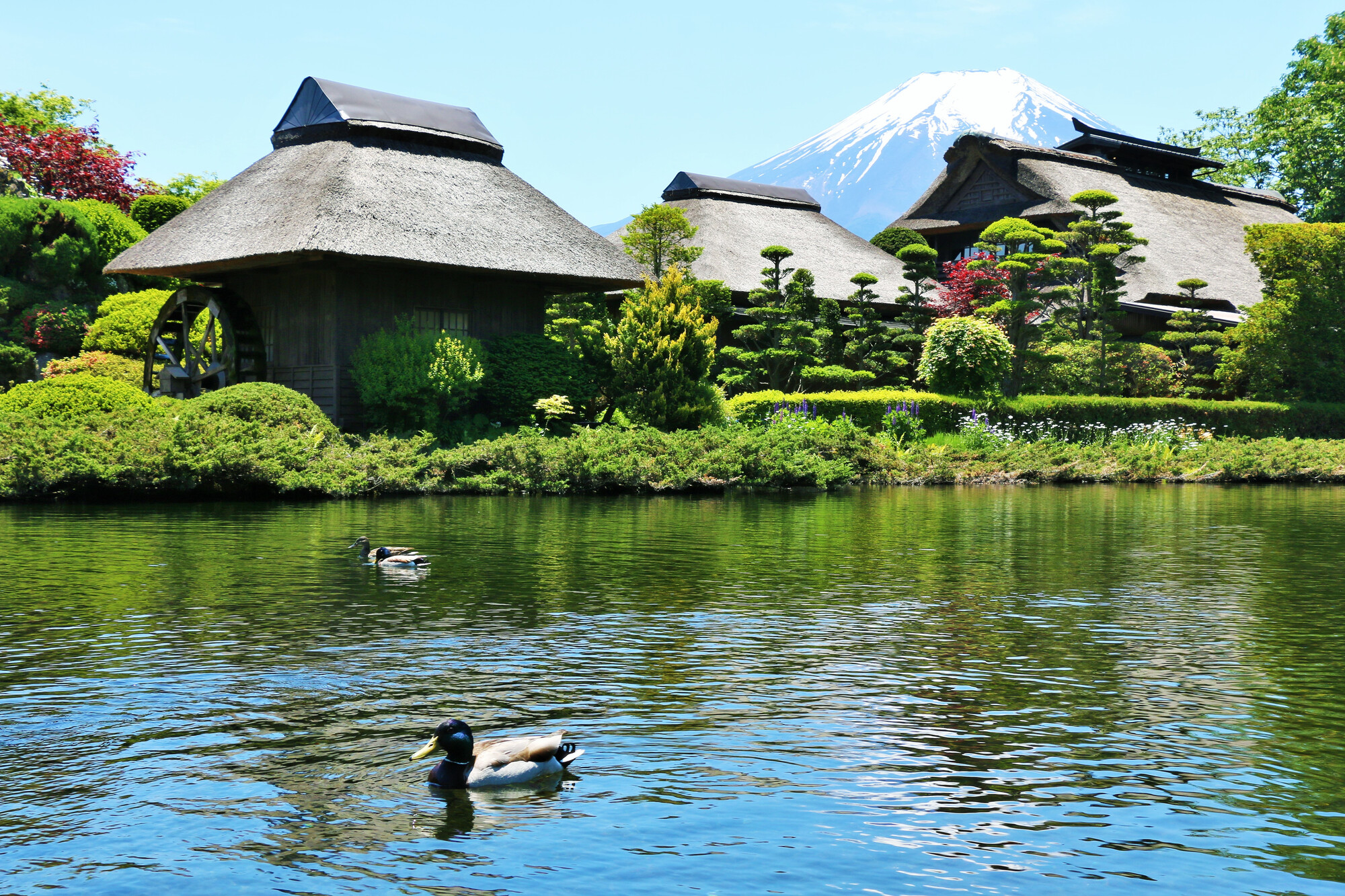 传统的茅草屋顶房屋和有鸭子的宁静池塘,背景是雄伟的富士山。