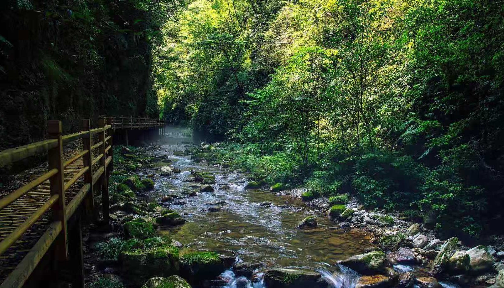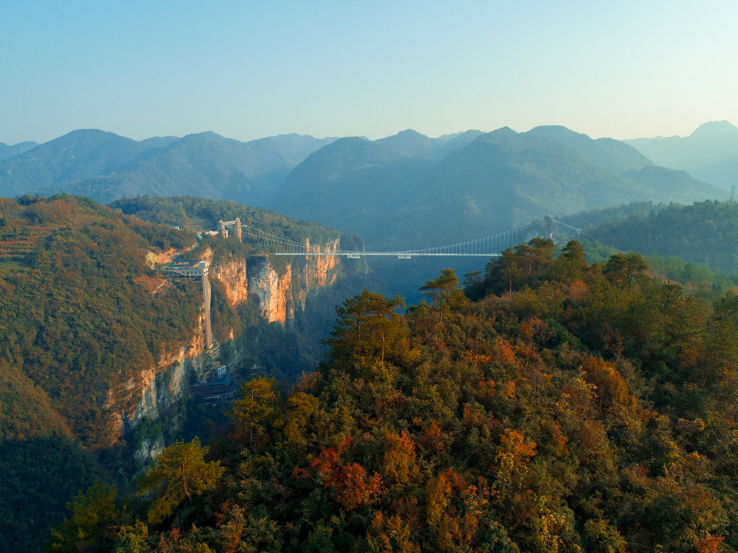张家界大峡谷集山、水、洞于一身,是张家界地貌的博物馆,在这里可观赏到北温带喀斯特地形的全部风景。峡谷里更是植被繁茂,空气清新,凉爽舒适,溪水上弥漫着一层薄雾,宛如来到世外桃源,让人烦恼顿消。既然到步大峡谷怎能不体验大峡谷玻璃桥的震撼?这座玻璃桥位于大峡谷景区内,是世界最高、跨度最长的玻璃桥,大桥建在大峡谷两侧的峰顶上,横跨大峡谷,桥面全部采用透明玻璃铺设,桥中心有全球最高的蹦极。站在桥上,脚下400米处的谷底全景尽收眼底,还能一享极限蹦极的惊险刺激。