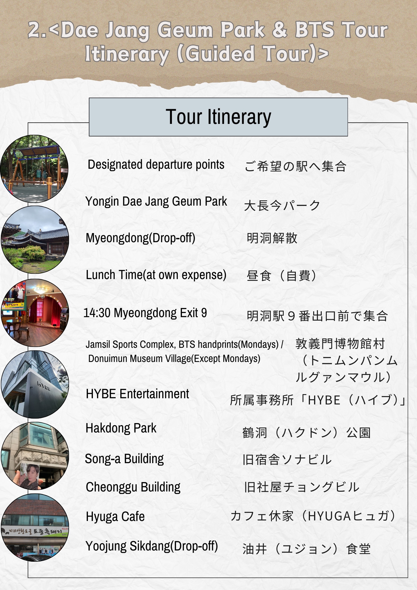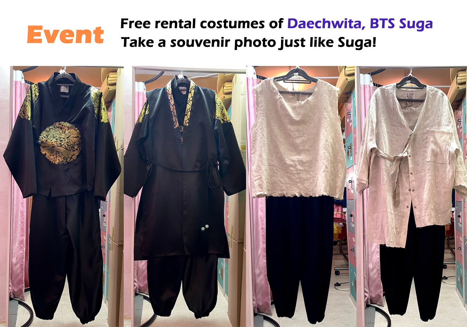 ▶ 周一大长今公园和防弹少年团之旅 的顾客准备了服饰(冬季(12 月至 2 月)和夏季(7 月至 8 月)或恶劣天气(如大雨)我们不提供活动服饰