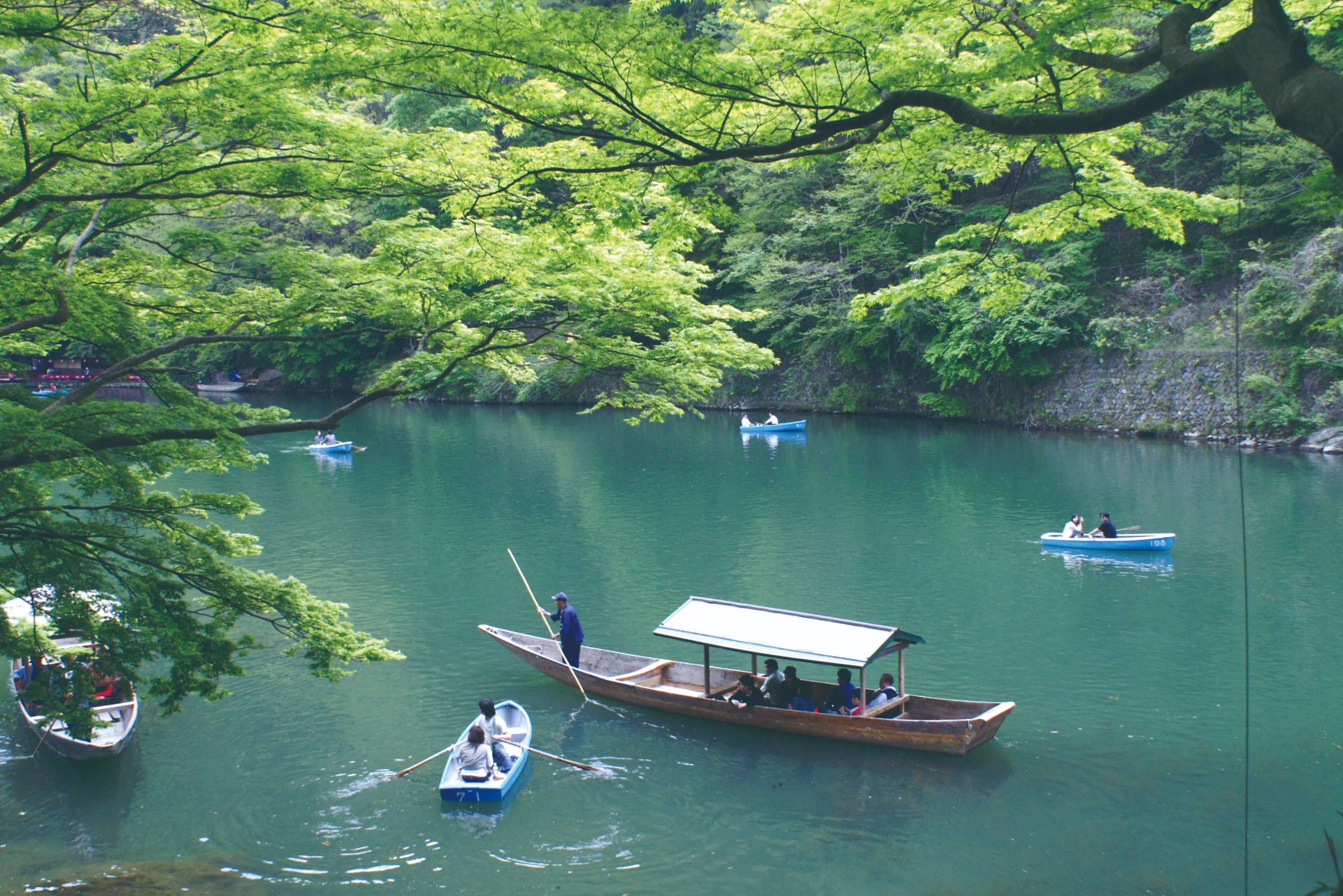 乘坐屋形船欣赏渡月桥和岚山的风景(夏季除外)