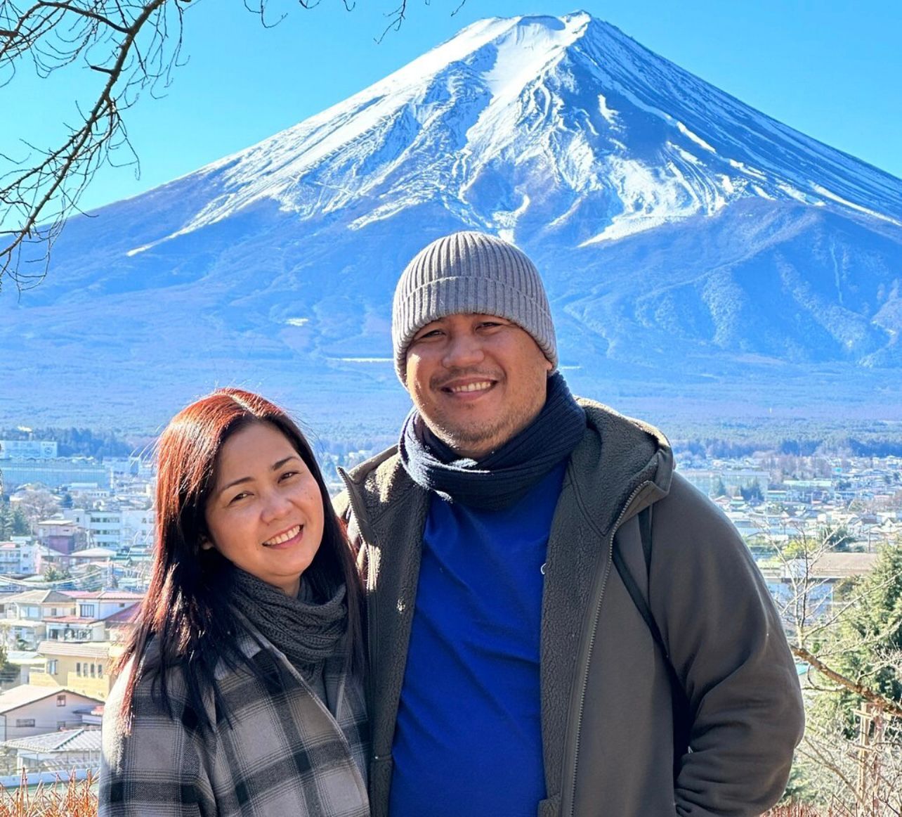 一对夫妇以雄伟的富士山为背景,享受着宁静的时刻。