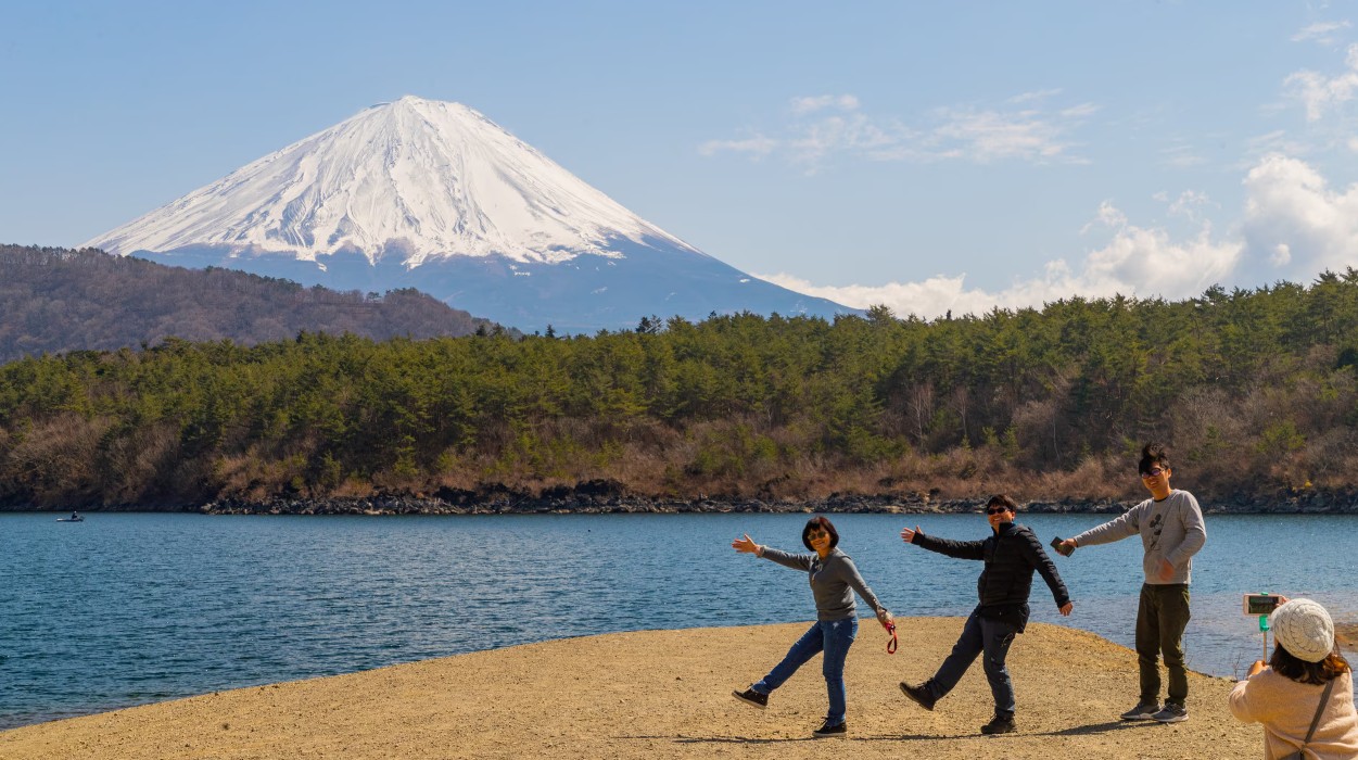 在西湖前发帖,周围环绕着树木繁茂的山脉和露营地,还有露天博物馆和手工艺村,背景是富士山的壮丽景色(如果去五合目或御殿场名牌折扣购物中心,可能没有时间)