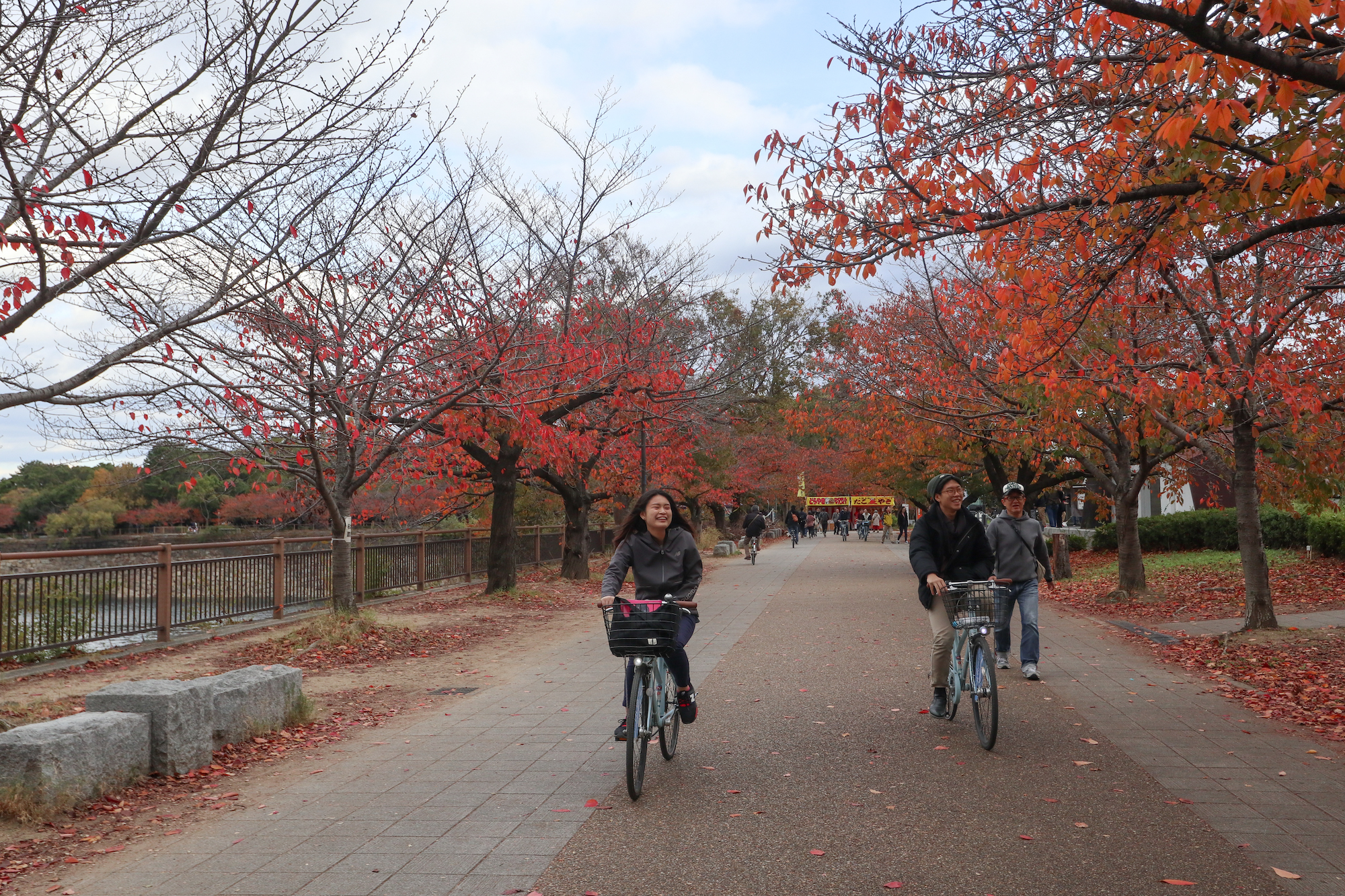 在这个小团旅游中,乘坐两轮车探索公园,探索护城河、神社和花园