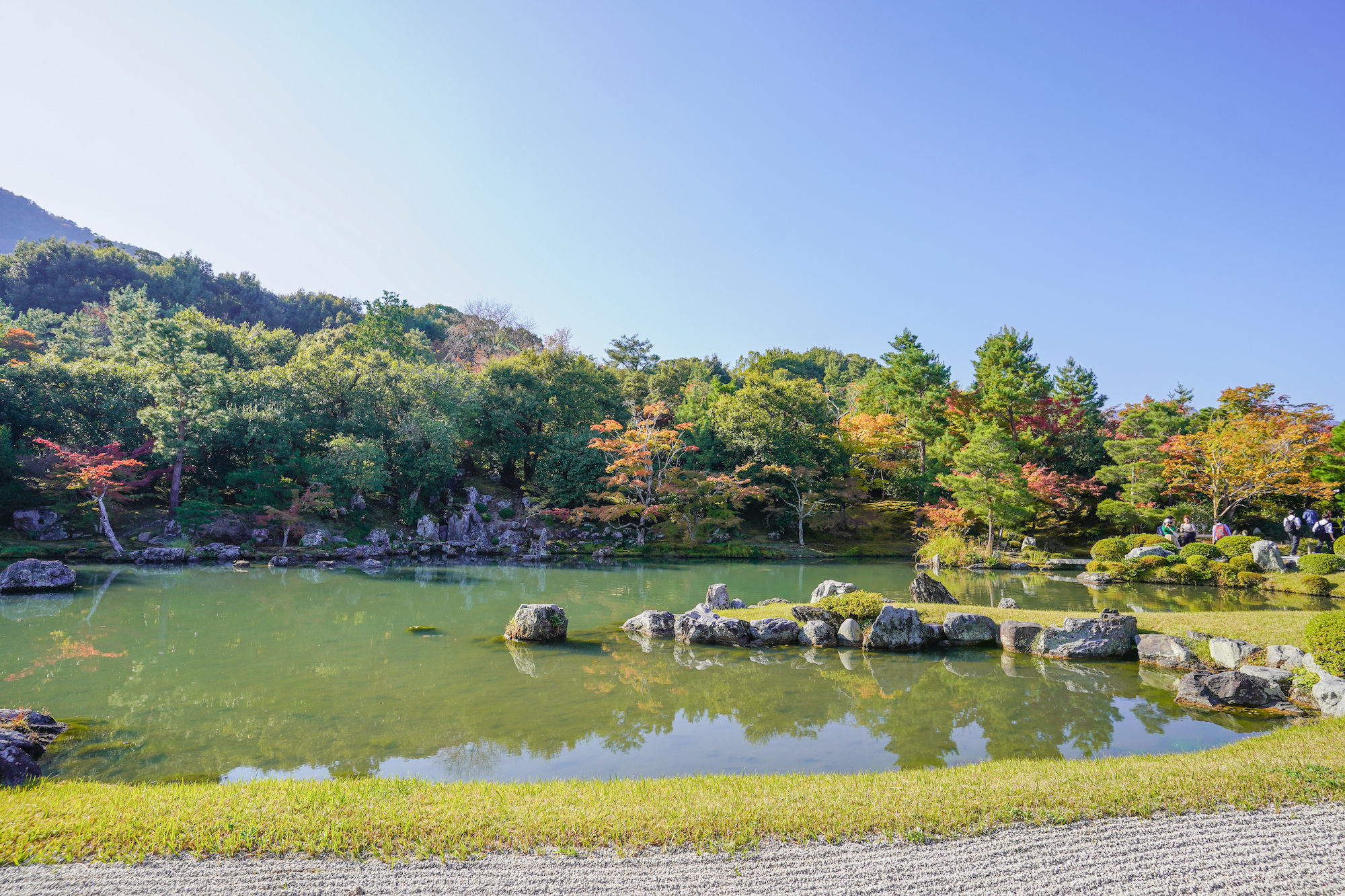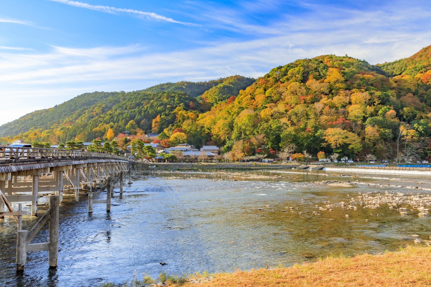 标志性的渡月桥是通往这一季节奇观的门户,宁静的大井河映衬着生机勃勃的色彩