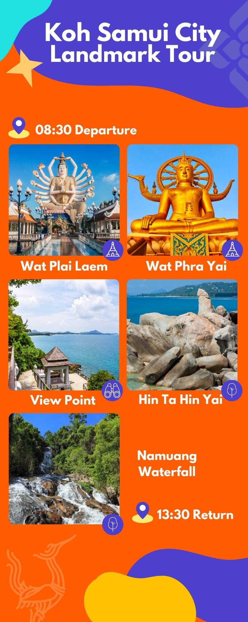踏上苏梅岛标志性地标的迷人旅程。从祖父岩开始,这是一种象征着生育和爱的独特岩层。继续前往令人印象深刻的大佛,这是一尊雄伟的金色雕像,俯瞰着岛屿,享有令人惊叹的全景。探索宁静的 Wat Plai Laem,这是一座精致的寺庙,拥有引人注目的雕像和华丽的建筑。在查汶观景台捕捉壮丽的景色,那里广阔的海洋与郁郁葱葱的风景交汇在一起。最后,前往 Namuang Waterfall 1 探险,这是一处瀑布般的自然奇观,周围环绕着郁郁葱葱的绿色植物,是畅游的理想场所。这次冒险之旅将文化、自然和令人惊叹的景点融为一体,为您留下关于苏梅岛迷人美景的珍贵回忆。