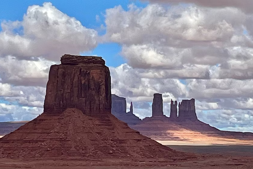 纪念碑谷标志性的山丘和台地高耸在沙漠景观的映衬下
