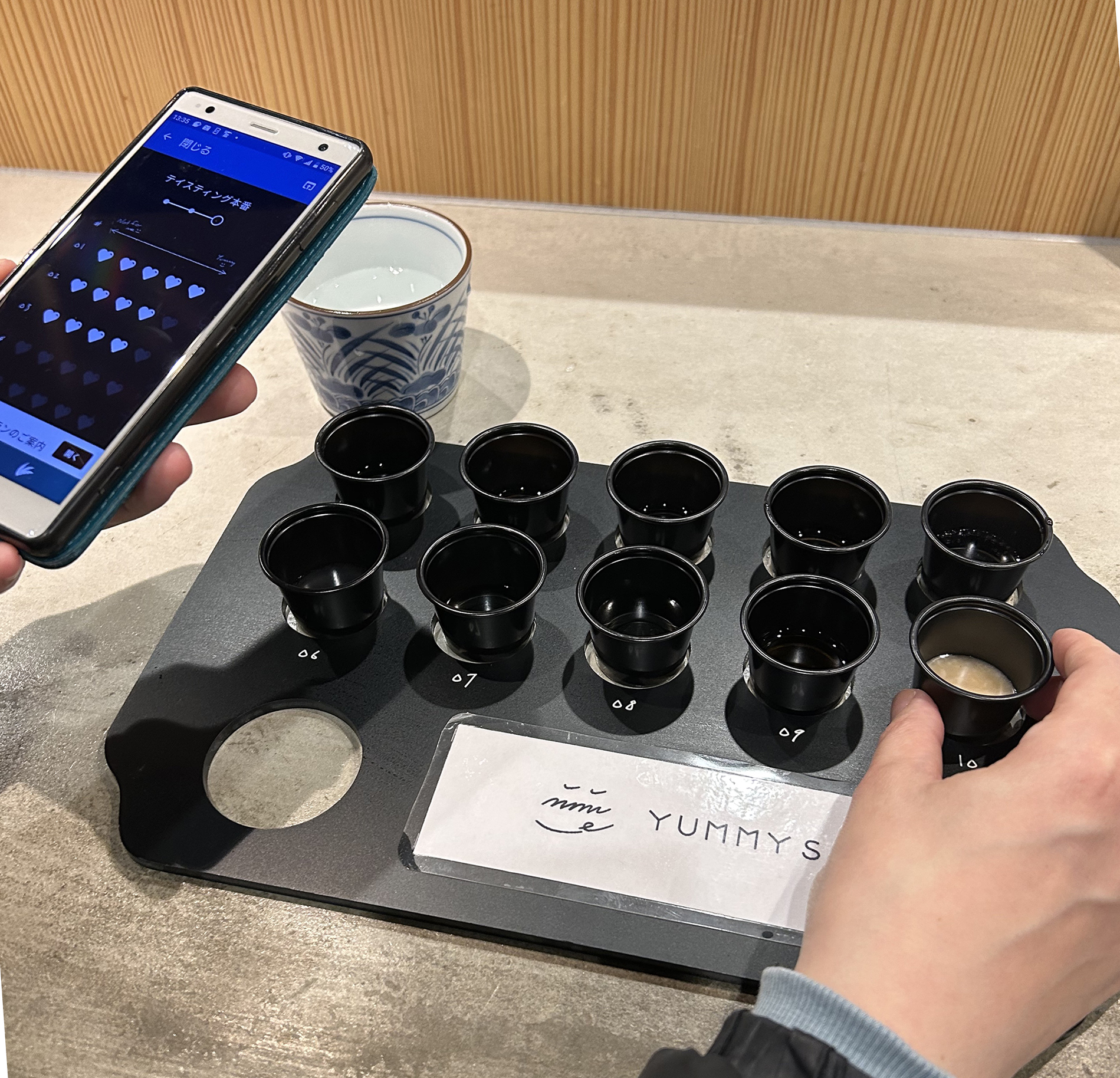 ・首先,使用 AI 套件按顺序测试 10 种少量清酒,每种都有不同的风味和颜色。按照 AI 推荐的口味品尝符合您口味的清酒。之后,客户将通过饮酒比较来进一步了解清酒的深度。